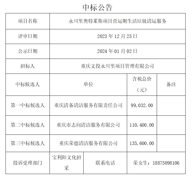 永川里奥特莱斯项目营运期生活垃圾清运服务中标公告